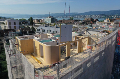 Dans le quartier populaire de « Seefeld », un bâtiment des années 30 a été entièrement rénové et surélevé selon un système de construction bois. L’étage ajouté comprend quatre appartements. Compte tenu de son faible poids, le bois permet une telle surélévation et présente encore d’autres avantages: une courte durée de construction sur site et des émissions réduites. Dans le cadre du projet de la Münchhaldenstrasse, le montage du nouvel étage a pu être effectué en l’espace d’un mois. Les locataires pourront bénéficier dès le mois de mai 2021 d’un climat intérieur sain dans cette ville animée.
