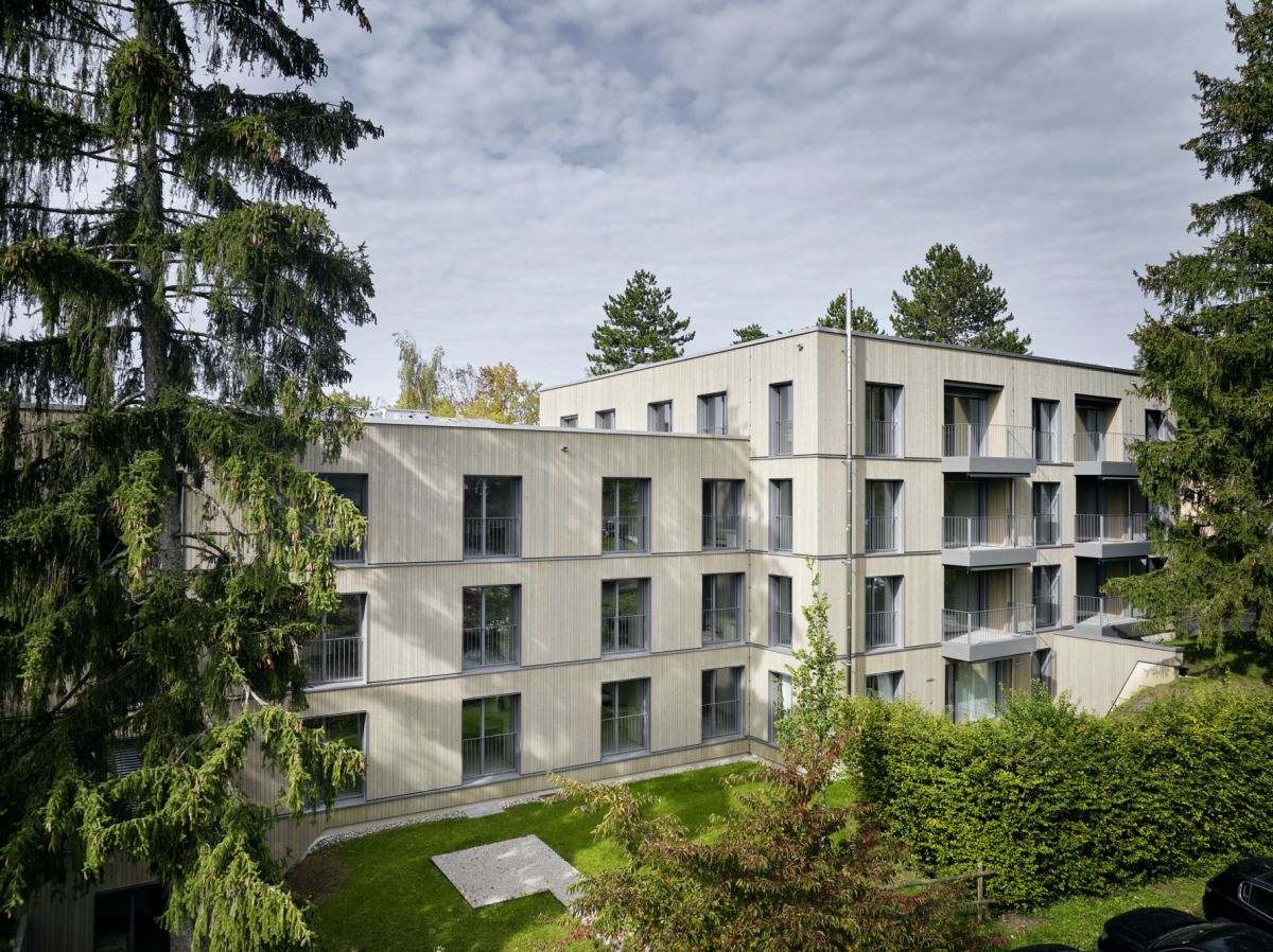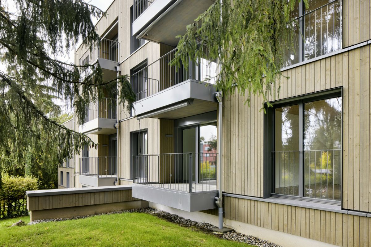 Quando un edificio si fonde con l’ambiente circostante significa che si è ottenuto un risultato architettonico degno di nota. Risultato che in questo caso è altresì legato alla considerazione strutturale degli alberi protetti. Si trattava infatti di estendere la superficie abitativa senza intaccare le piante. Con l’aiuto di Ecoscan, uno studio indipendente di consulenza ambientale con sede a Losanna, i progettisti hanno elaborato un concetto per conservare gli alberi e proteggerli con la massima cura durante la fase di costruzione. E a buona ragione considerato che gli oltre 2400 m² di spazio esterno sono da considerarsi un’area di aggregazione naturale. Da questa interazione tra edificio e ambiente scaturisce un complesso abitativo di grande armonia. Soprattutto la facciata si inserisce meravigliosamente nel contesto naturale. Secondo il capoprogetto Kevin Partensky, sembra che questo immobile ci sia da sempre.