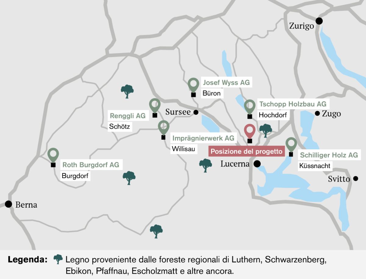 Prima che Renggli vi metta mano, il legno viene abbattuto in 12 aree forestali della regione e trasportato nella segheria Josef Wyss AG di Büron. Le tavole di legno massiccio vengono poi trasformate in legno da costruzione presso la Schilliger Holz AG di Küssnacht, in strutture portanti e legno lamellare presso la Roth Burgdorf AG di Burgdorf e in rivestimenti per le facciate dalla Imprägnierwerk AG di Willisau. Tschopp Holzbau AG di Hochdorf realizza infine i soffitti in legno massicci e li consegna a Renggli direttamente in cantiere.
