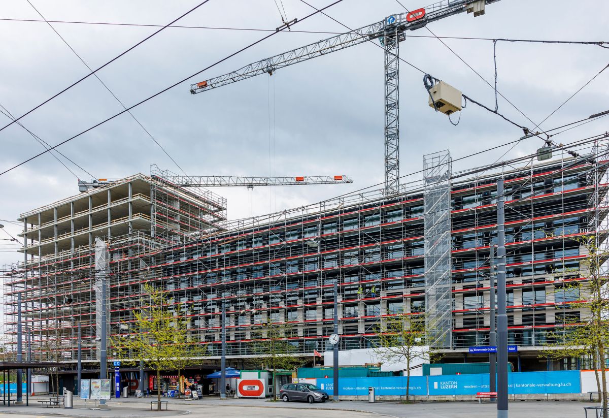 La nuova amministrazione cantonale di Lucerna professa valori chiari quali regionalità, ecologia e diversità. In Seetalplatz a Emmen sta sorgendo il nuovo edificio amministrativo del Cantone di Lucerna, che ospiterà uffici, alloggi e strutture ricreative. Composto da un basamento di sei piani e da una torre di dieci, sarà un vero e proprio monumento alla costruzione in legno sostenibile, anche se a prima vista non si direbbe. Tuttavia, all’interno risulta evidente quanto grande sia l’impegno cantonale a favore dell’ecologia: diciamo almeno quanto 5'100 m3 di tronchi provenienti dalle foreste del Cantone o, se si preferisce, 200 camion a pieno carico provenienti dagli stabilimenti Renggli. Particolarmente suggestivo e ligneo sarà l’atrio che sorgerà nella corte interna. Il cosiddetto cuore di legno – che in realtà rimanda all’immagine di una cattedrale – si propone quale principale punto d’incontro dei collaboratori. Losinger Marazzi, in collaborazione con lo studio di architettura Max Dulder Architekten e l’ingegnere del legno Pirmin Jung, ha sviluppato questo progetto di edificio ecologico e lo sta realizzando nelle vesti di impresa totale. Renggli è responsabile della costruzione ibrida legno-calcestruzzo, che prevede, ad esempio, elementi delle pareti che raggiungono 4.5 tonnellate di peso e 12 metri di lunghezza: sfide logistiche non da poco ancor prima che i 430 immensi elementi in legno approdino in cantiere. Infatti, secondo il concetto ecologico del Cantone, ogni tavola utilizzata deve provenire dalla silvicoltura sostenibile delle foreste della regione (da Luthern a Hohenrain, attraverso tutto il Cantone).