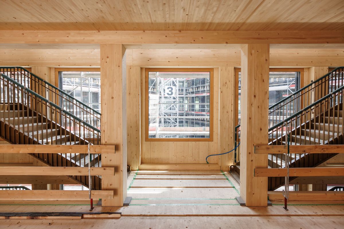 Nell’atrio della nuova amministrazione cantonale, spiccano gli imponenti elementi in legno, alcuni dei quali vantano fino a 4.5 tonnellate di peso. L’atrio occupa la corte interna dell’edificio e funge da principale luogo d’incontro per i 2'000 dipendenti. Non visibile dall’esterno, il «cuore di legno » è un manifesto notevole nonché una dichiarazione di impegno a favore dell’edilizia ecologica in legno e dell’economia circolare sostenibile.