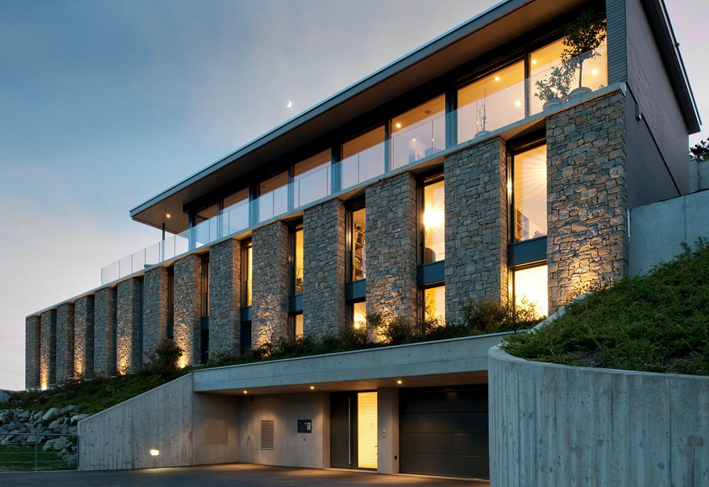 Uno splendido palazzo in legno rivestito in pietra sui due piani inferiori, che crea un collegamento esteticamente perfetto con il vicino Castello dei Paleari. L’edificio vanta una felice combinazione di legno, pietra e vetro e si integra a meraviglia nell’ambiente. La vista sul lago Ceresio è impressionante. Il difficile accesso per i camion ha richiesto l’utilizzo degli elicotteri per il montaggio degli elementi in legno.