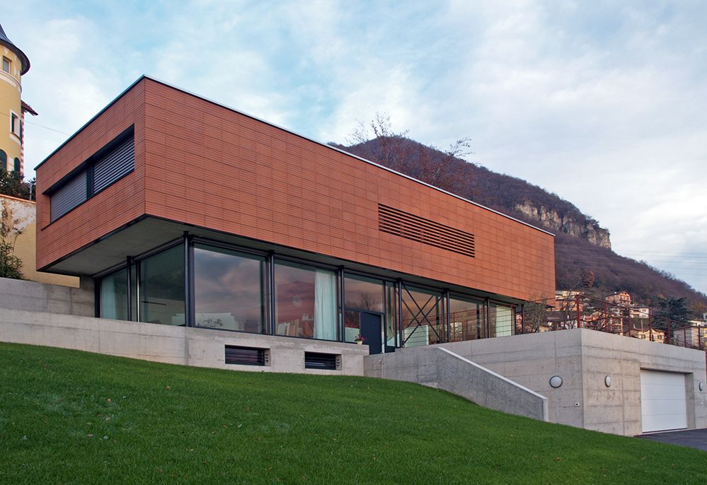 Dov’è il legno? In realtà, in questa casa dall’architettura molto ricercata, si vede solo sul soffitto del primo piano! Con il suo zoccolo vetrato a pianterreno che sorregge il piano superiore aggettante, la casa assume una forma leggera, ma strutturalmente solida. Domina Salorino dalla collina, con una splendida vista su Mendrisio. La costruzione in legno poggia sulla piattaforma in calcestruzzo sostenuta da pilastri in acciaio nello zoccolo vetrato. Data la difficile accessibilità della parcella, gli elementi in legno prefabbricati sono stati montati con l’elicottero, per poi essere rivestiti sul posto con tavelle di terracotta, il materiale tradizionale del Mendrisiotto. Questo progetto ha saputo sfruttare perfettamente il peso ridotto e l’elevata resistenza del legno.