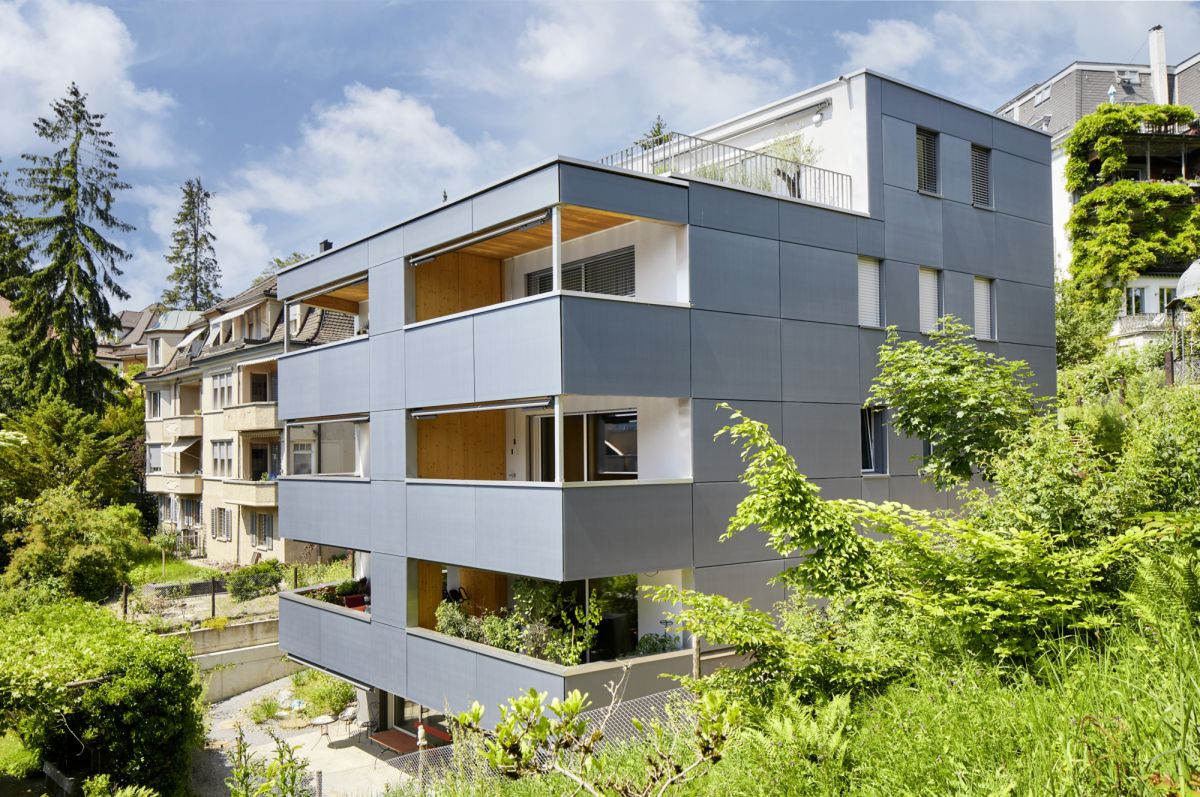 Dorothee Dietrich sognava un edificio che si distinguesse in ogni singolo aspetto: presenza architettonica, atmosfera abitativa e in particolare bilancio energetico. Per lei, ad esempio, l’idea piuttosto costosa di rivestire la facciata di moduli fotovoltaici andava assolutamente sposata. Una facciata futuristica che permette all’edificio di guadagnare preziosi punti Minergie-P, ma anche di brillare in uno straordinario look grigio blu.