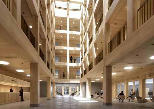 Realizzazione dell’edificio ibrido di dieci piani con il suggestivo atrio «Herz aus Holz» (Cuore di legno).
